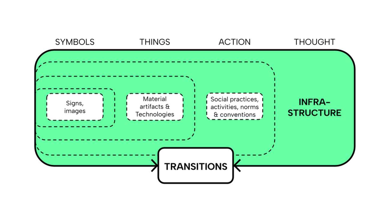 Diagram of infrastructure components that play a role in framing transitions. The diagram highlights the importance of thinking in terms of the 4 orders of design when addressing transition issues.
